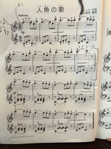 5歳の生徒さんが、人魚の歌に入りました。綺麗な曲でおっとりとしていて好きな人が多いですね。ただこの曲は拍数の数え方が8分の6拍子になり、今までの4分音符を2拍と数えます。そのためリズムが変わりますが生徒さんは理解して最後まで頑張りました!よく嫌にならずに頑張りましたね。これからも色々な事を覚えていきましょう♪生徒さんの成長は嬉しいですね?