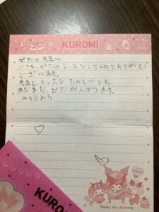 生徒さんがお手紙を持ってきて私にくださいました。内容が嬉しいですね♪普段真面目で、とても素直な生徒さんです。お手紙ありがとうございます!今度は私からお返事を書きたいと考えています。