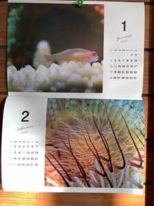 スキューバーダイビングをする大人の生徒さんがいます。海に潜って写真を撮ってカレンダーにしました。とても素敵なカレンダーなので、レッスン室に飾りました。今年はいい事ありそうですね♪